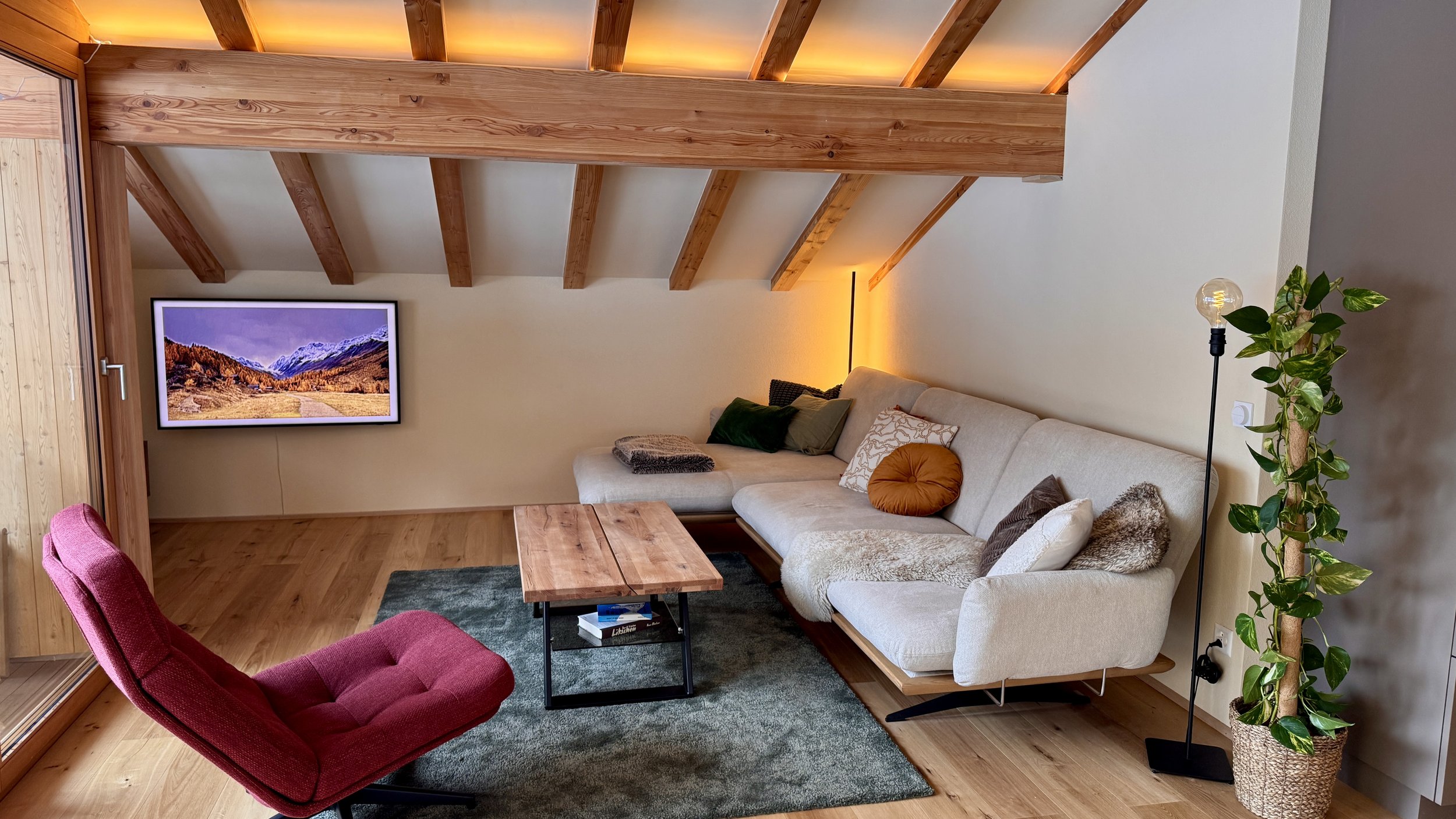 Das Penthouse im Dachgeschoss verbindet alpine Geborgenheit mit modernem Wohnkomfort. Natürliche Materialien, warme Farben und viel Licht schaffen eine Atmosphäre im Alpenchic zum Ankommen und Wohlfühlen.