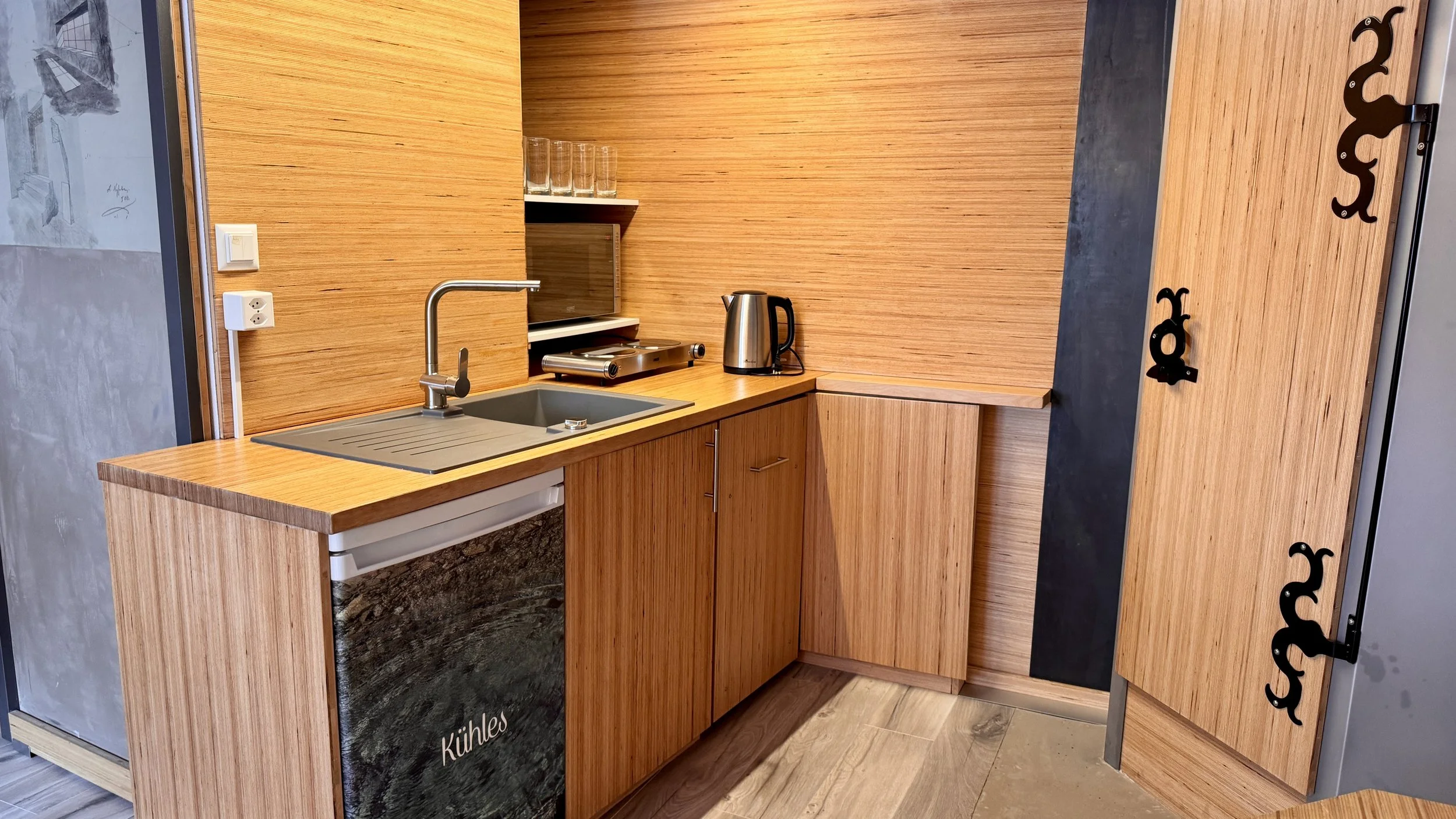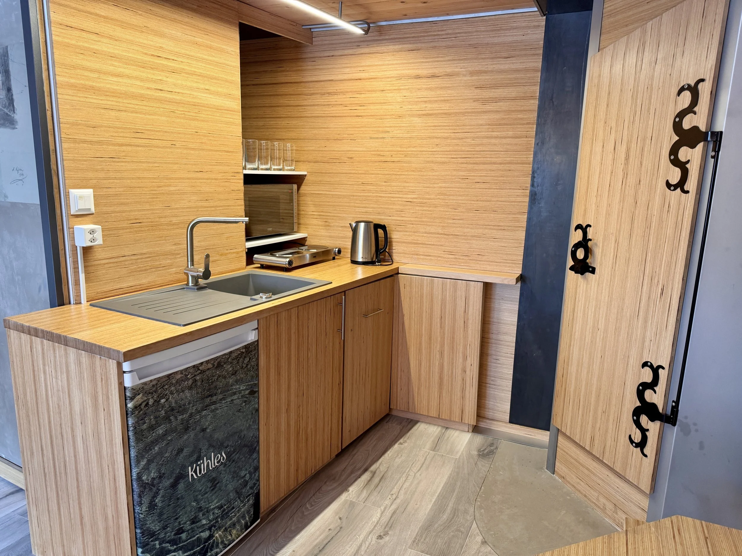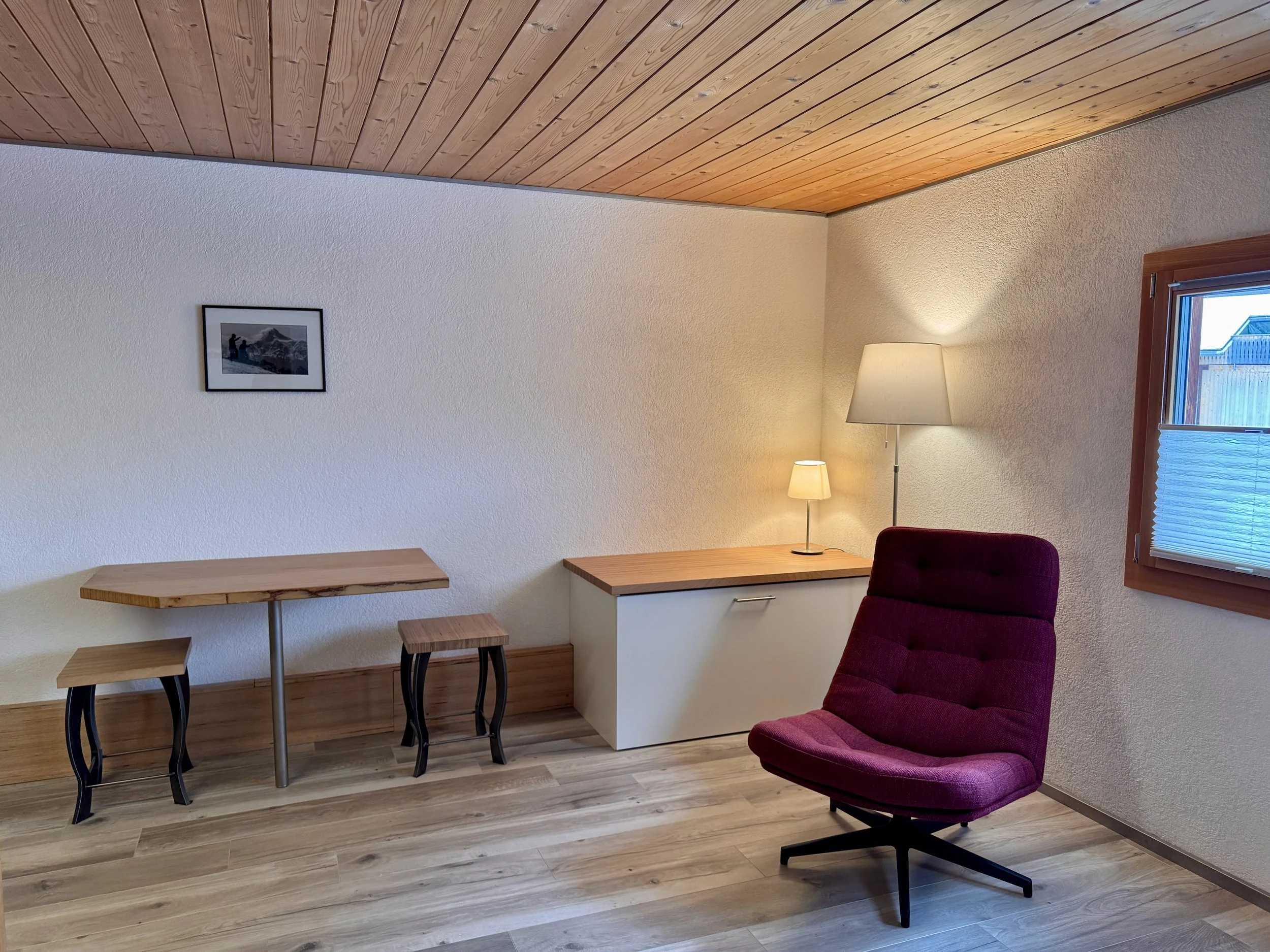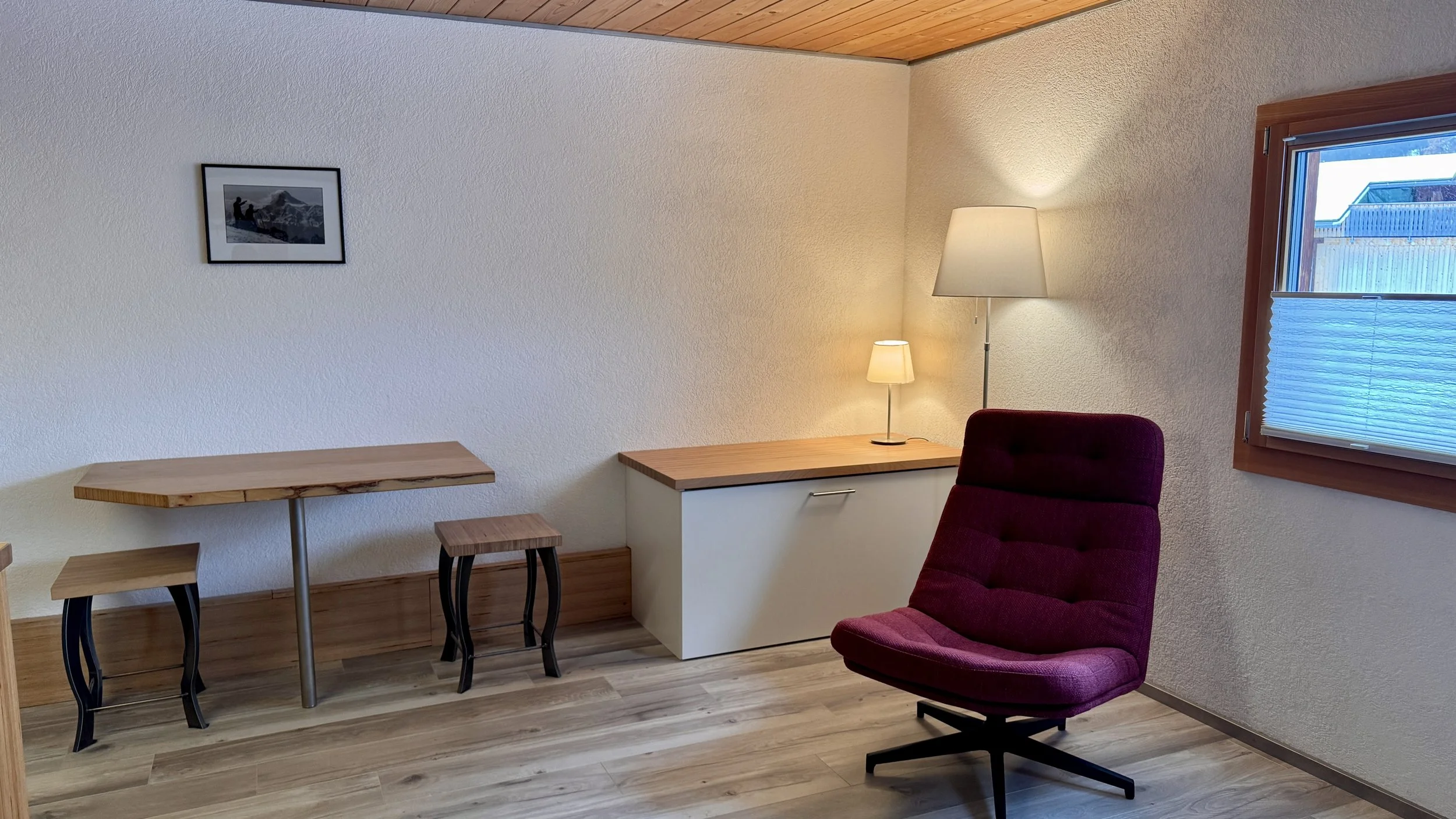 Das Studio besteht aus einem Zimmer mit Schlafsofa, einer funktionalen Kochnische, gemütlichen Lesestühle und einem Badezimmer mit Dusche.
